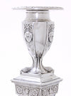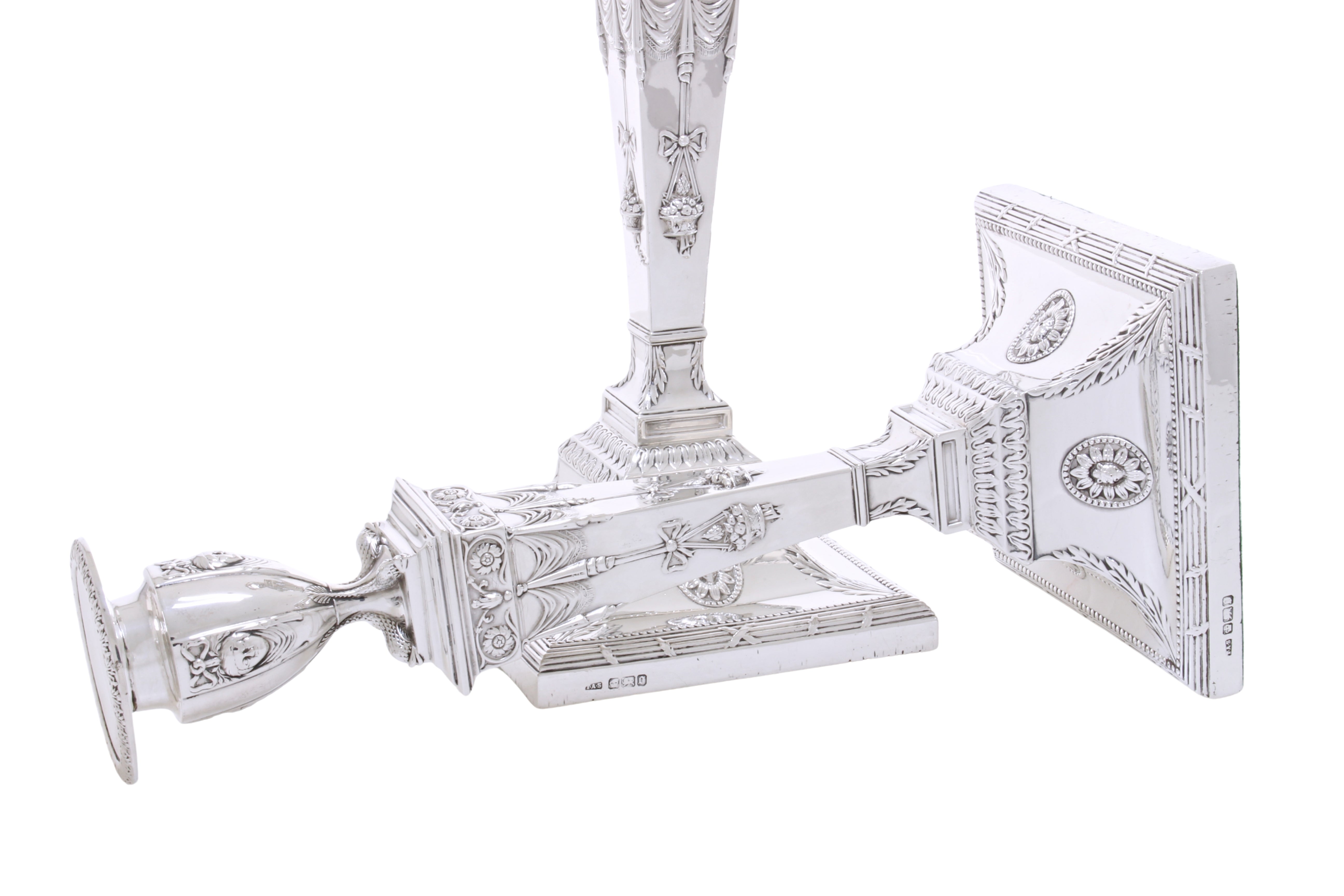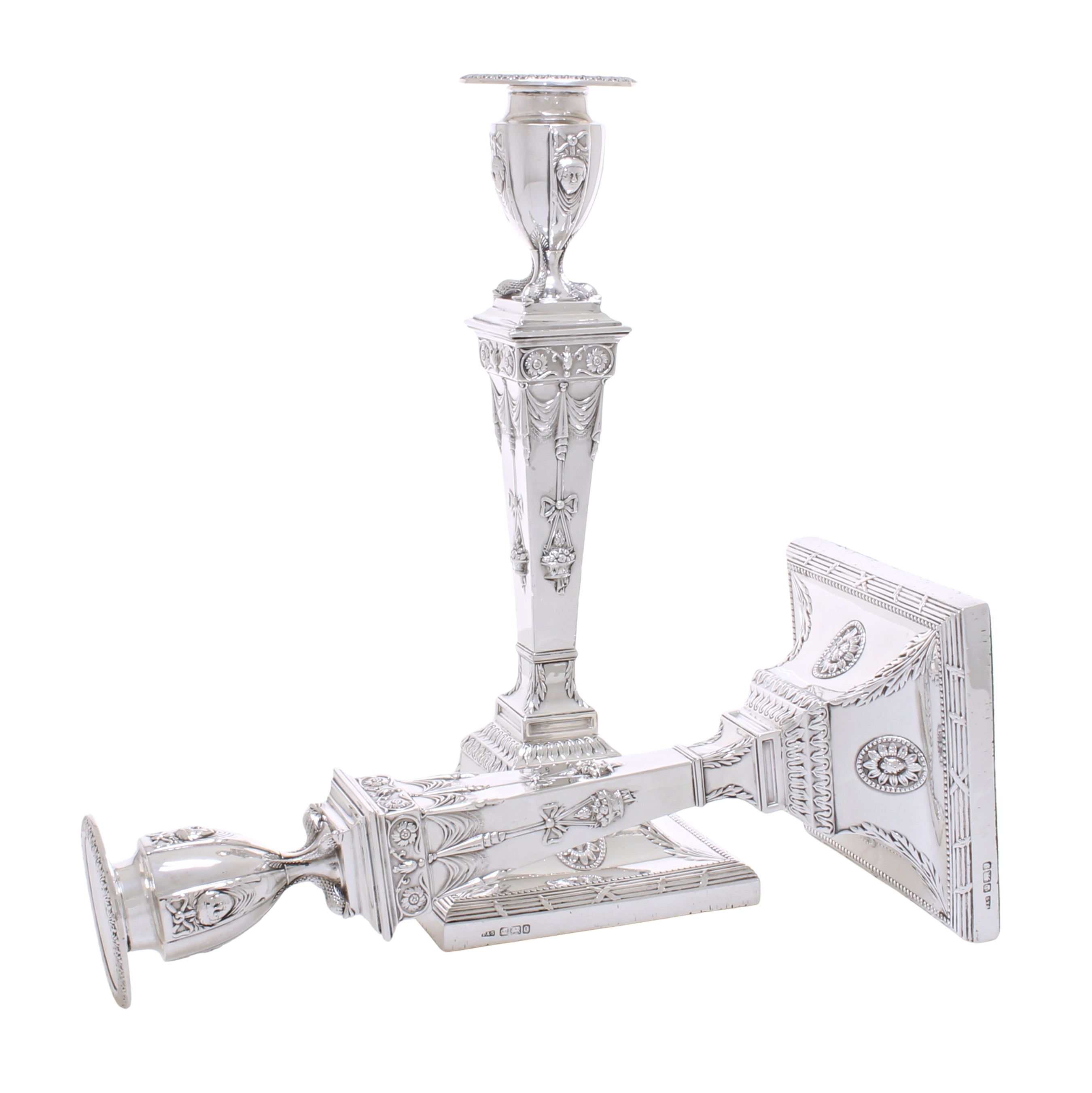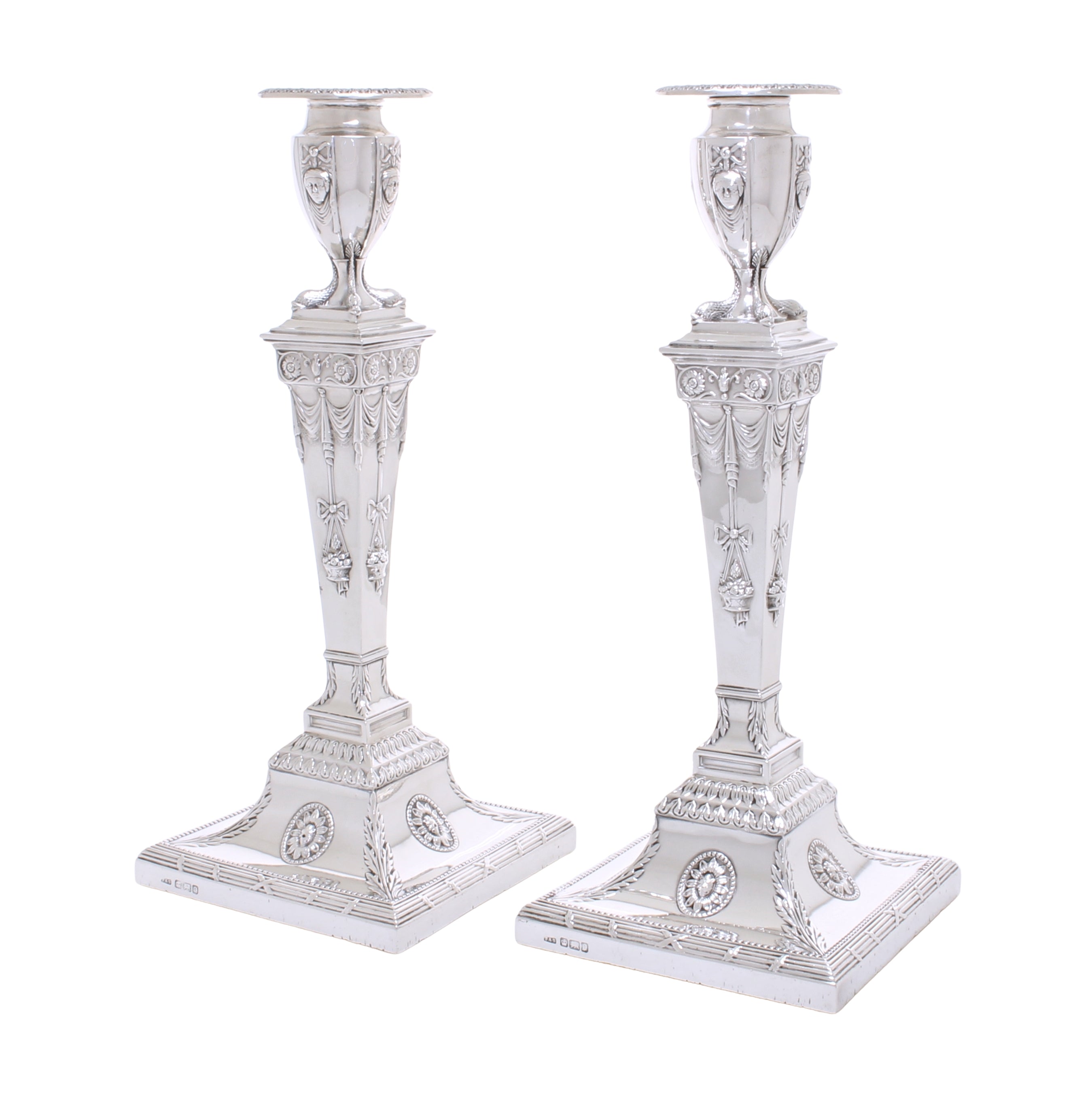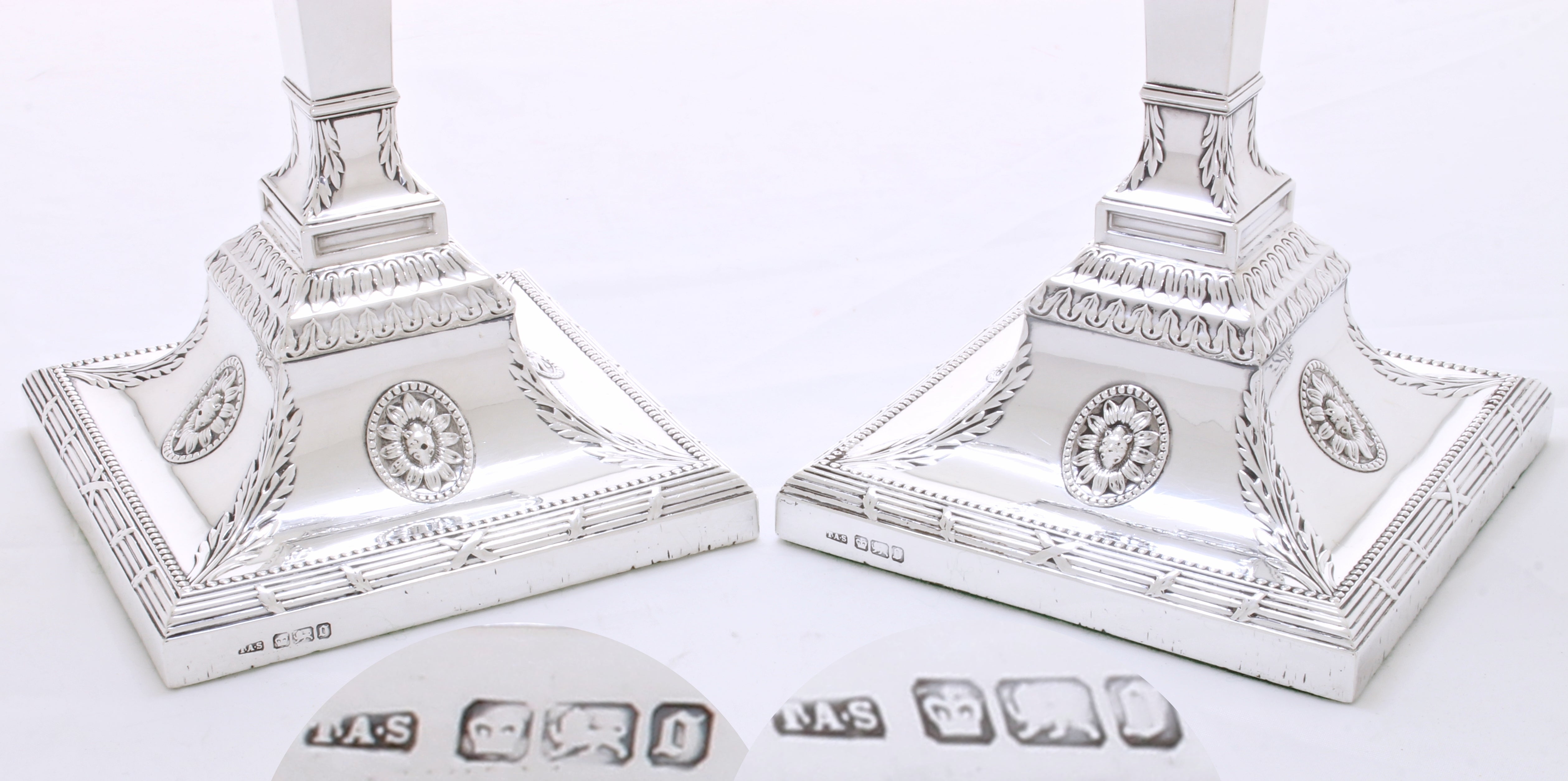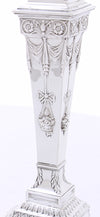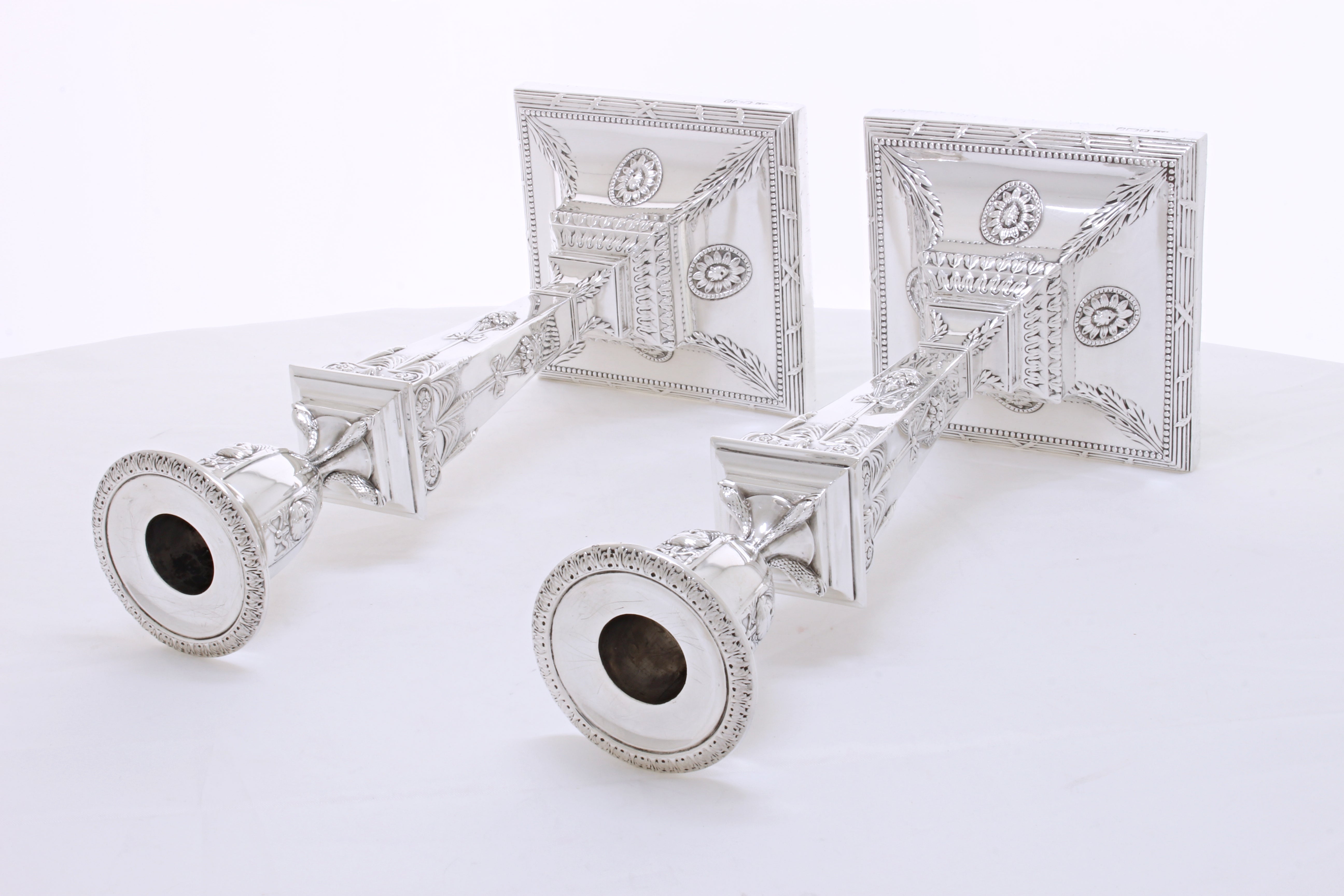 Een zeer fraai antiek paar tafelkandelaars van sterling zilver, in neo klassieke stijl, met een vierkante doorsnede, aangebrachte randen met parelranddecoratie, taps toelopende kolommen en afneembare bobèches.