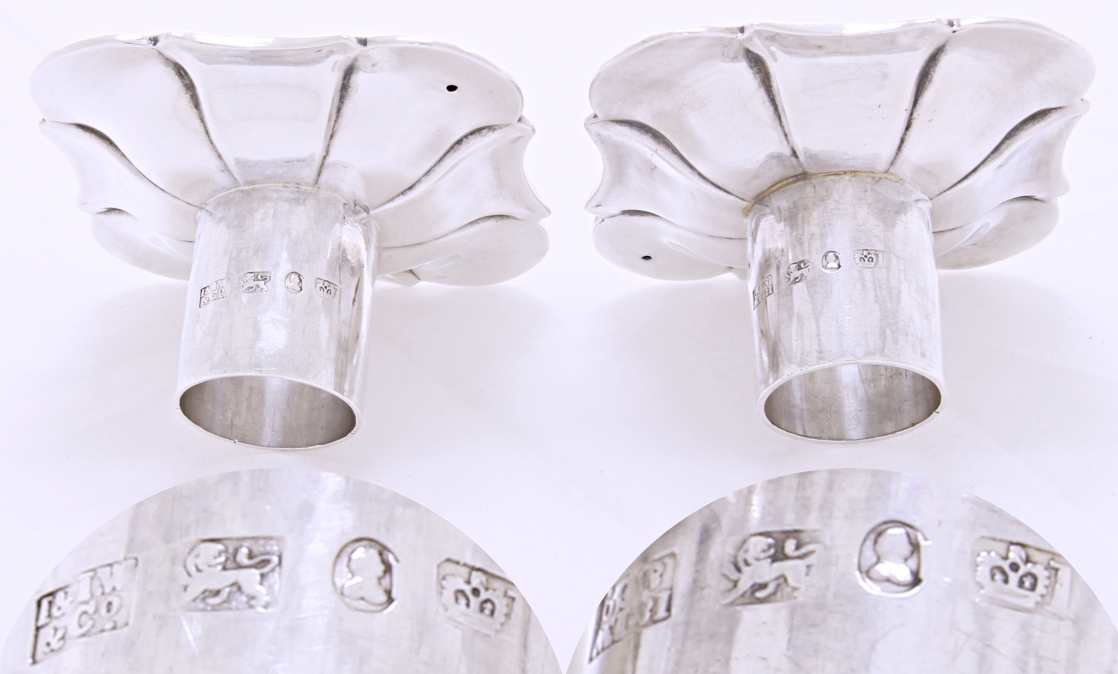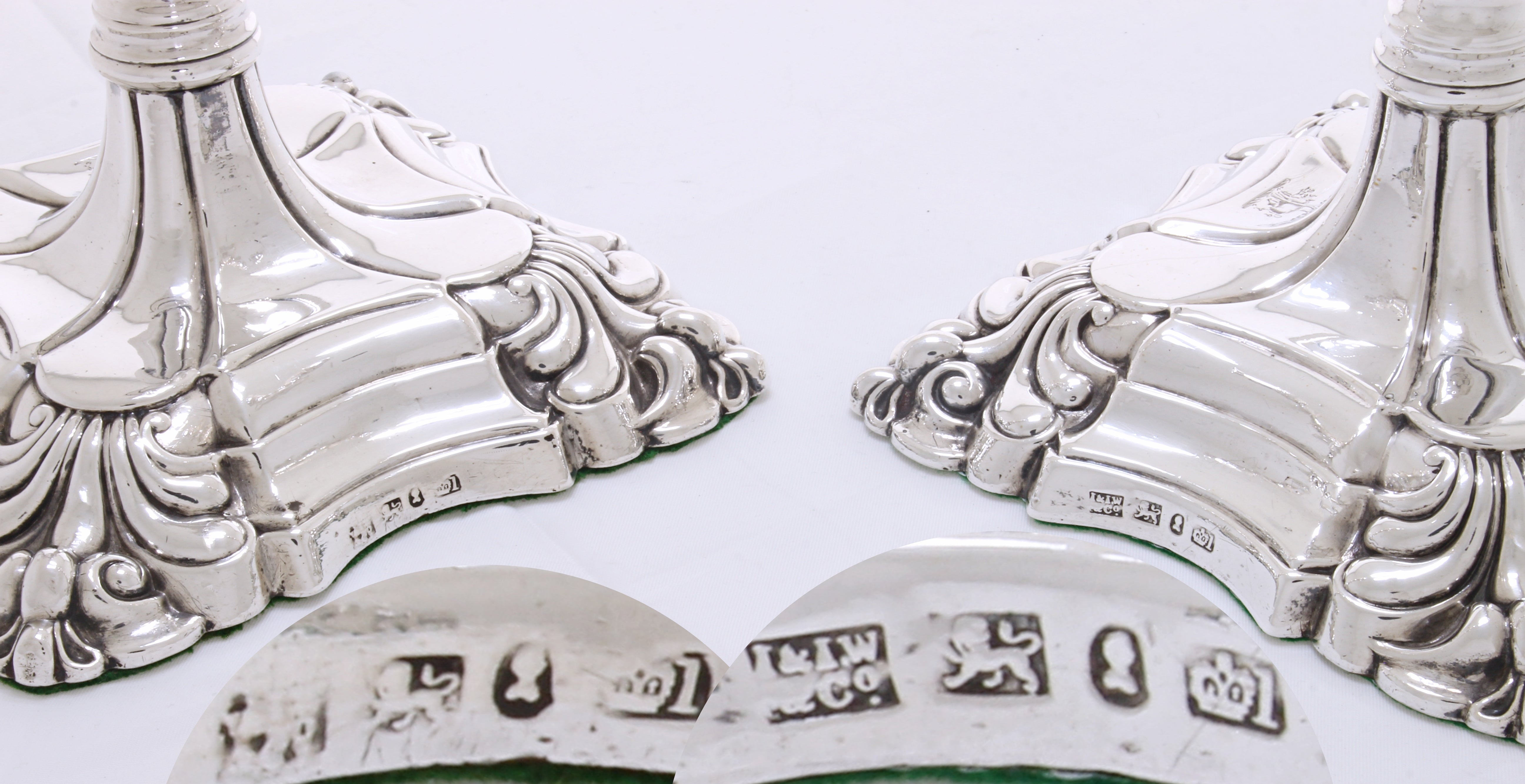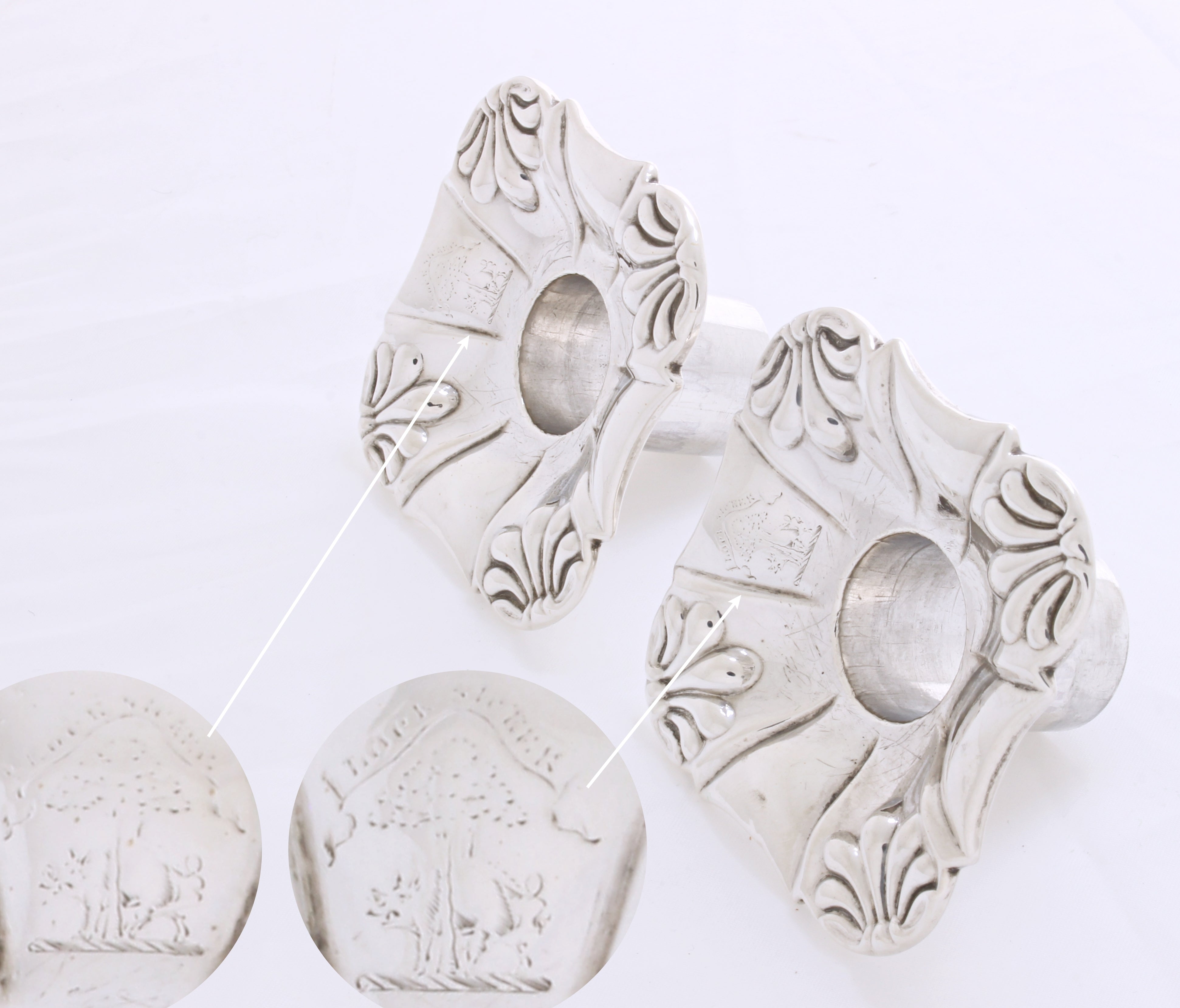 De afneembare bobèches en de onderzijdes zijn fijn gegraveerd met een wapenschild en motto.