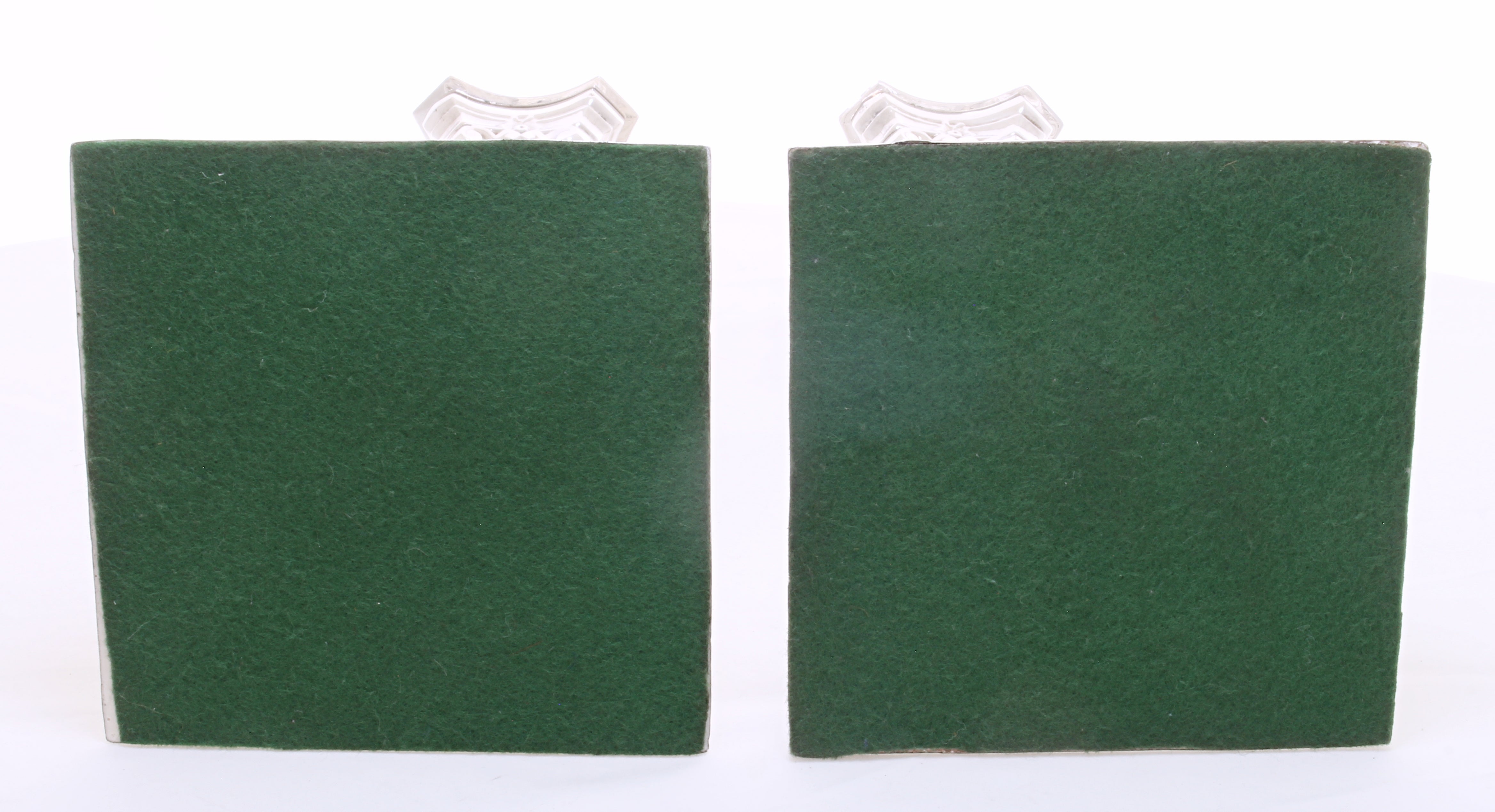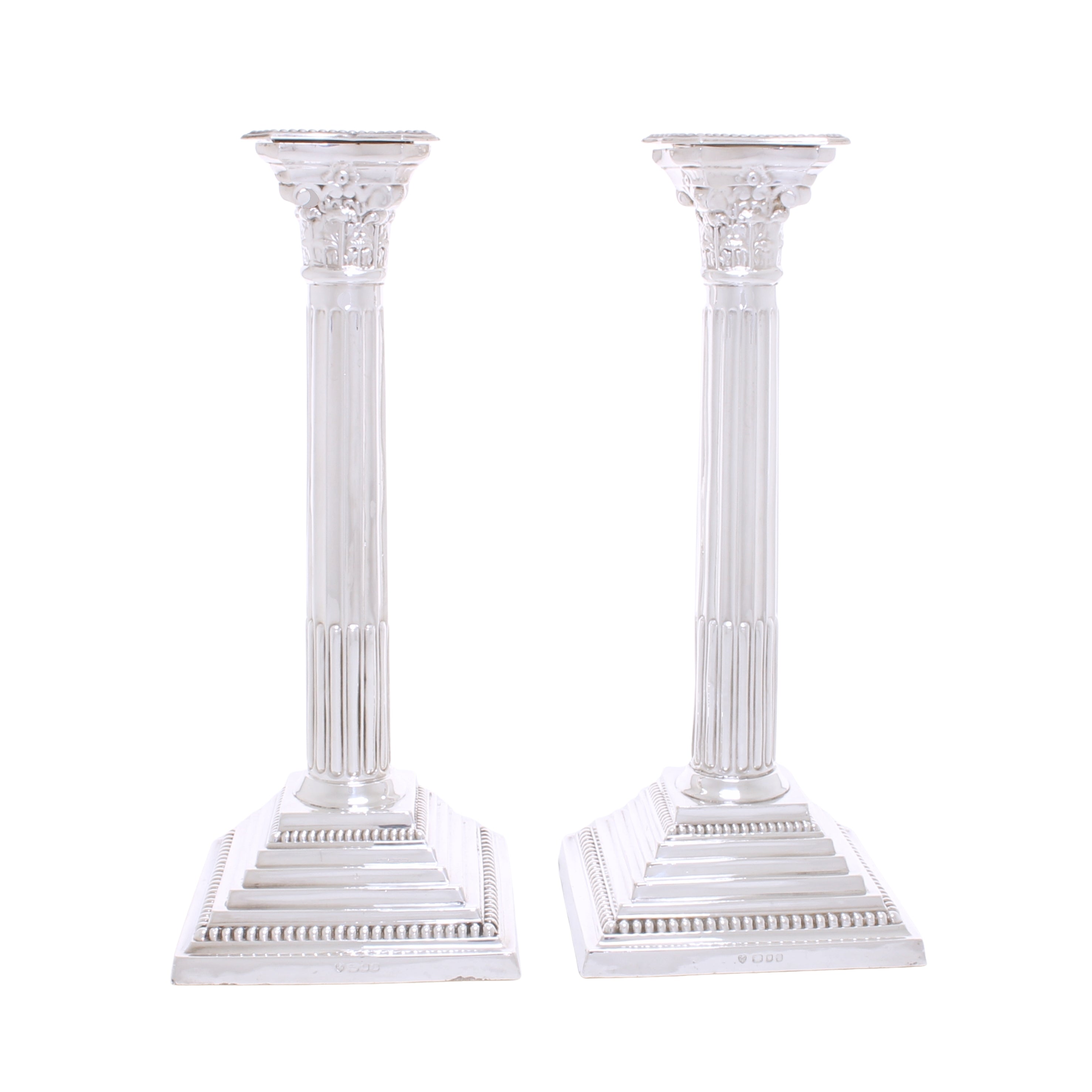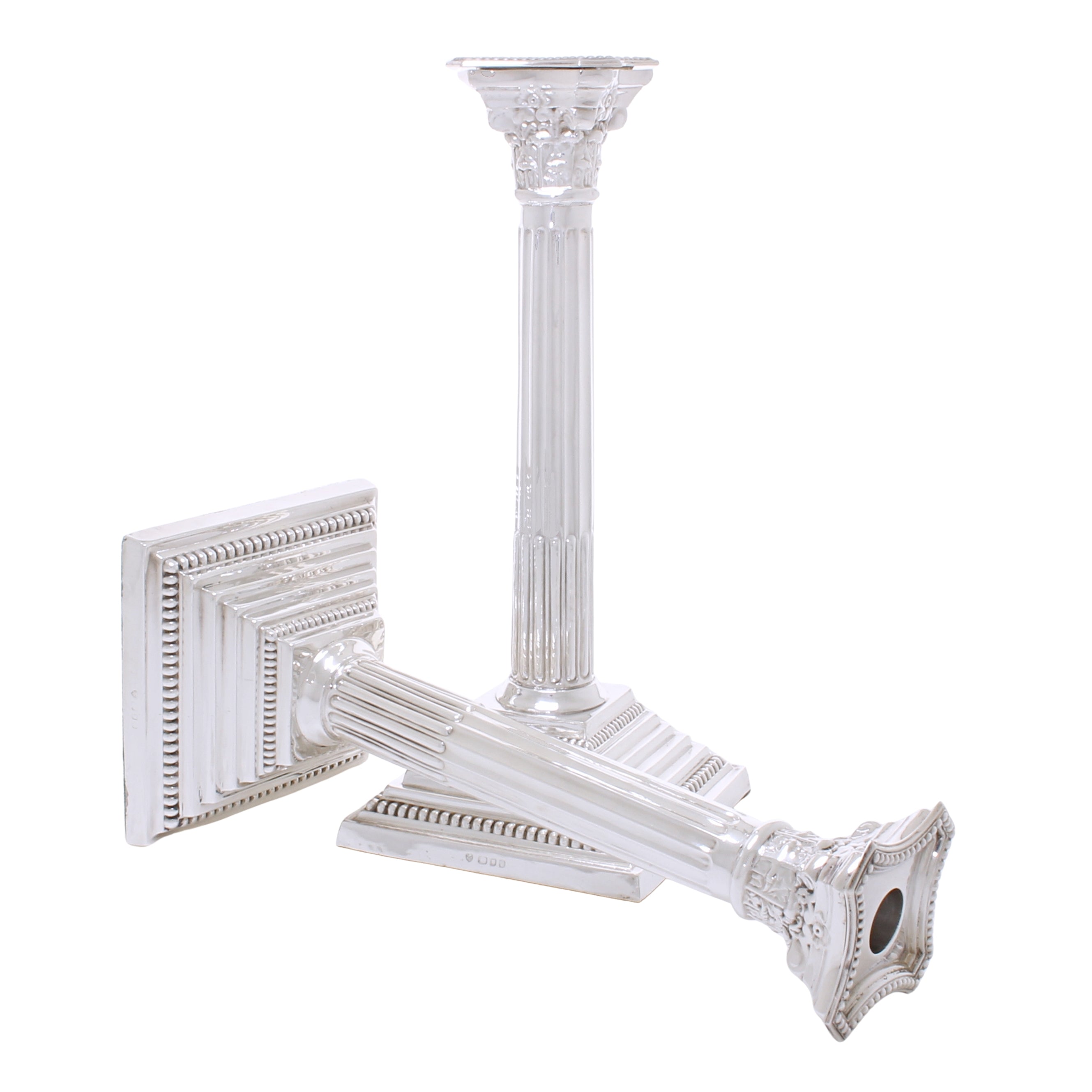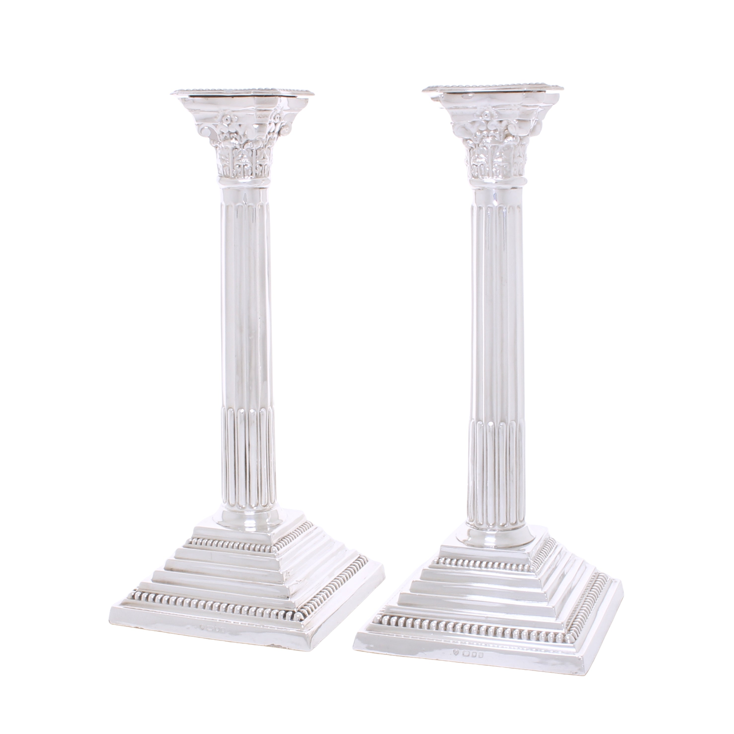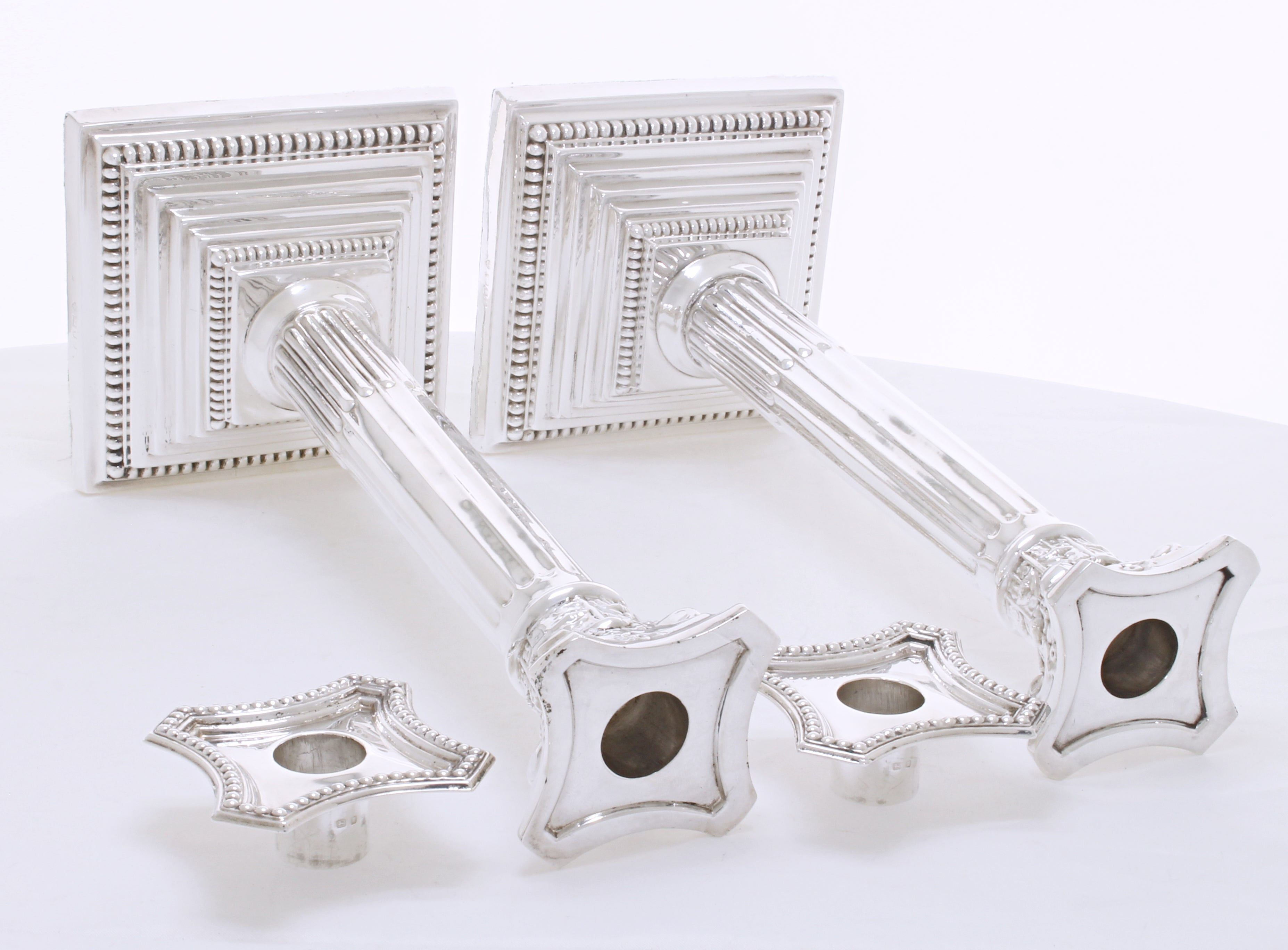 Engels zilveren kandelaars, in een Korinthische neoklassieke stijl. Afneembare bobeches met groen fluweel aan de onderzijde van de kandelaars.
