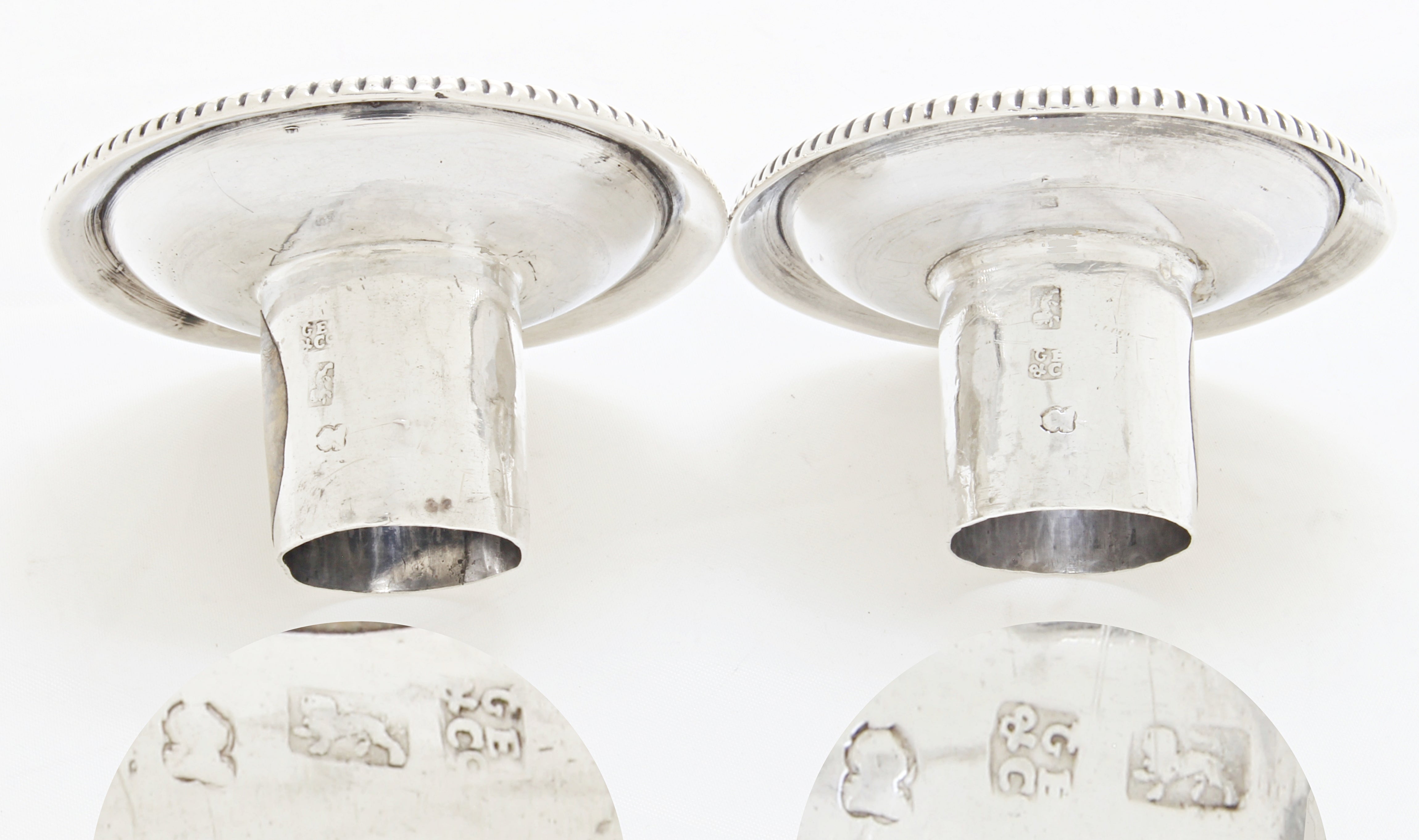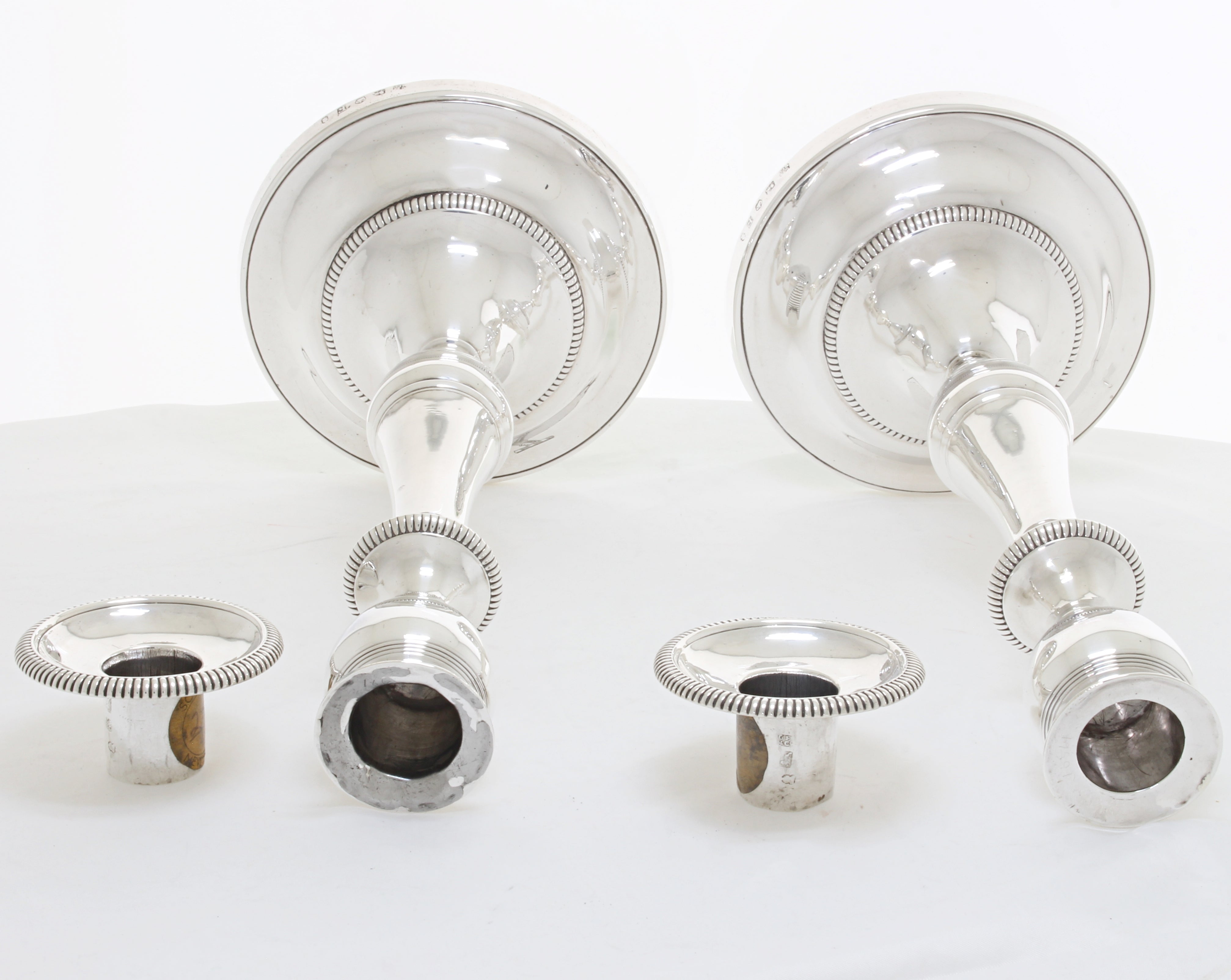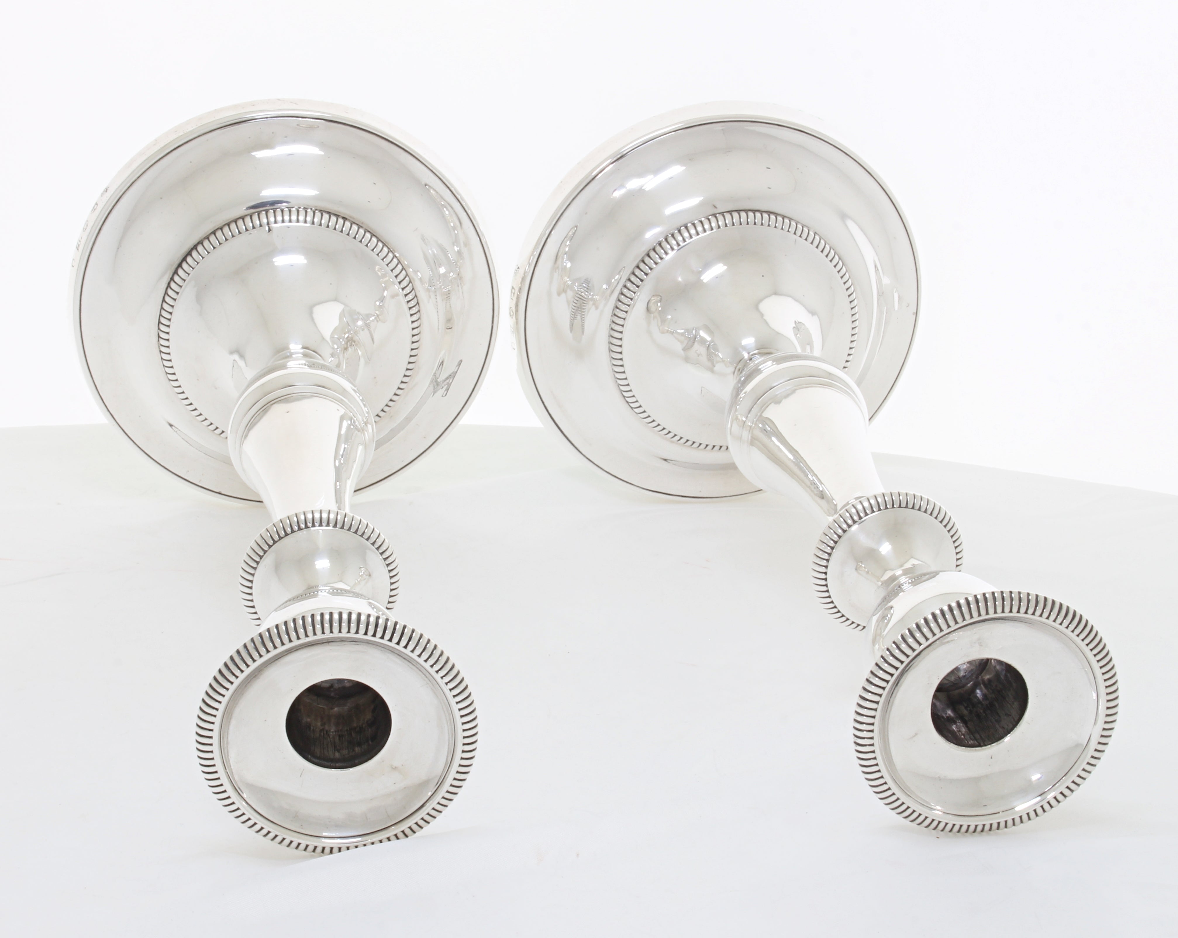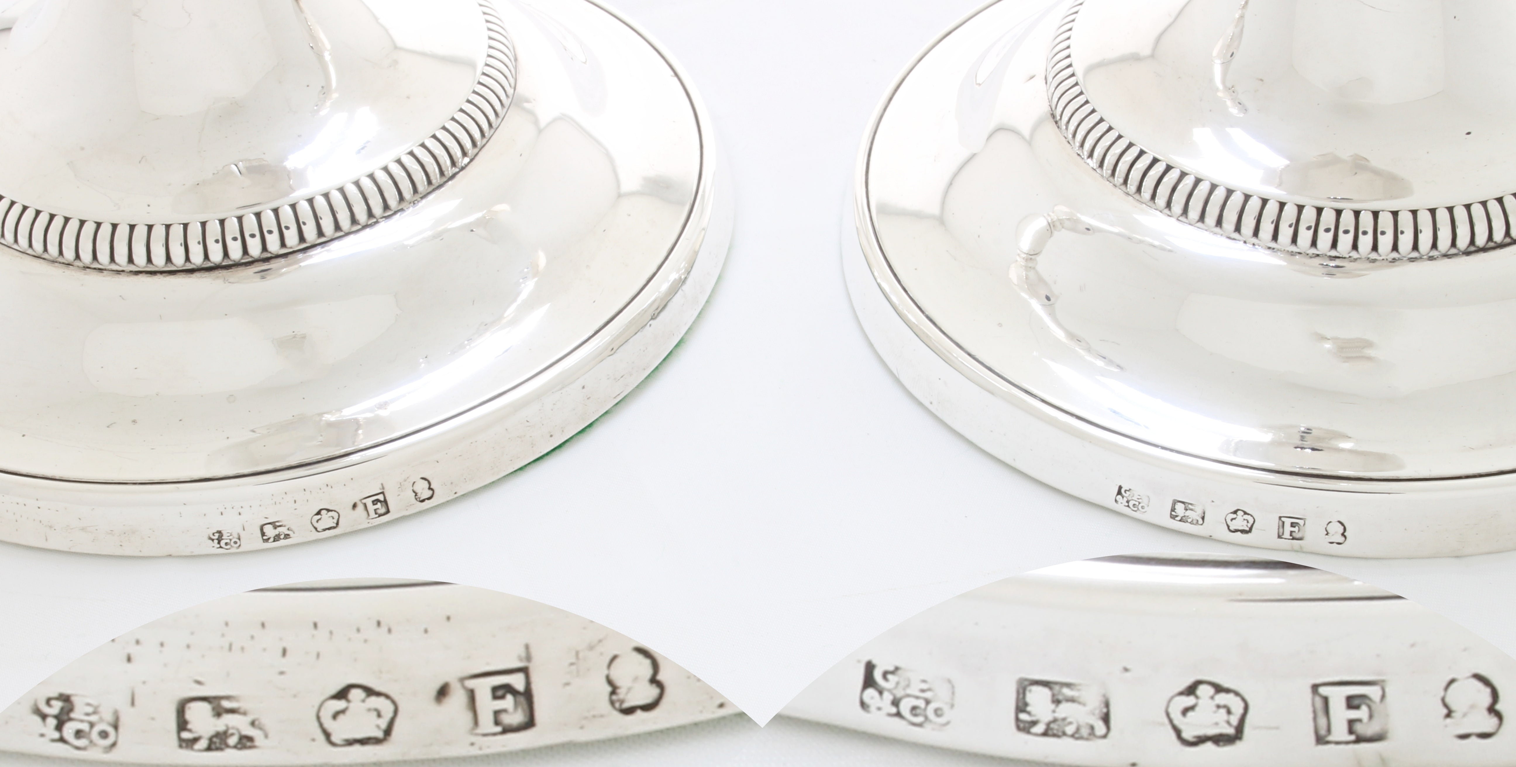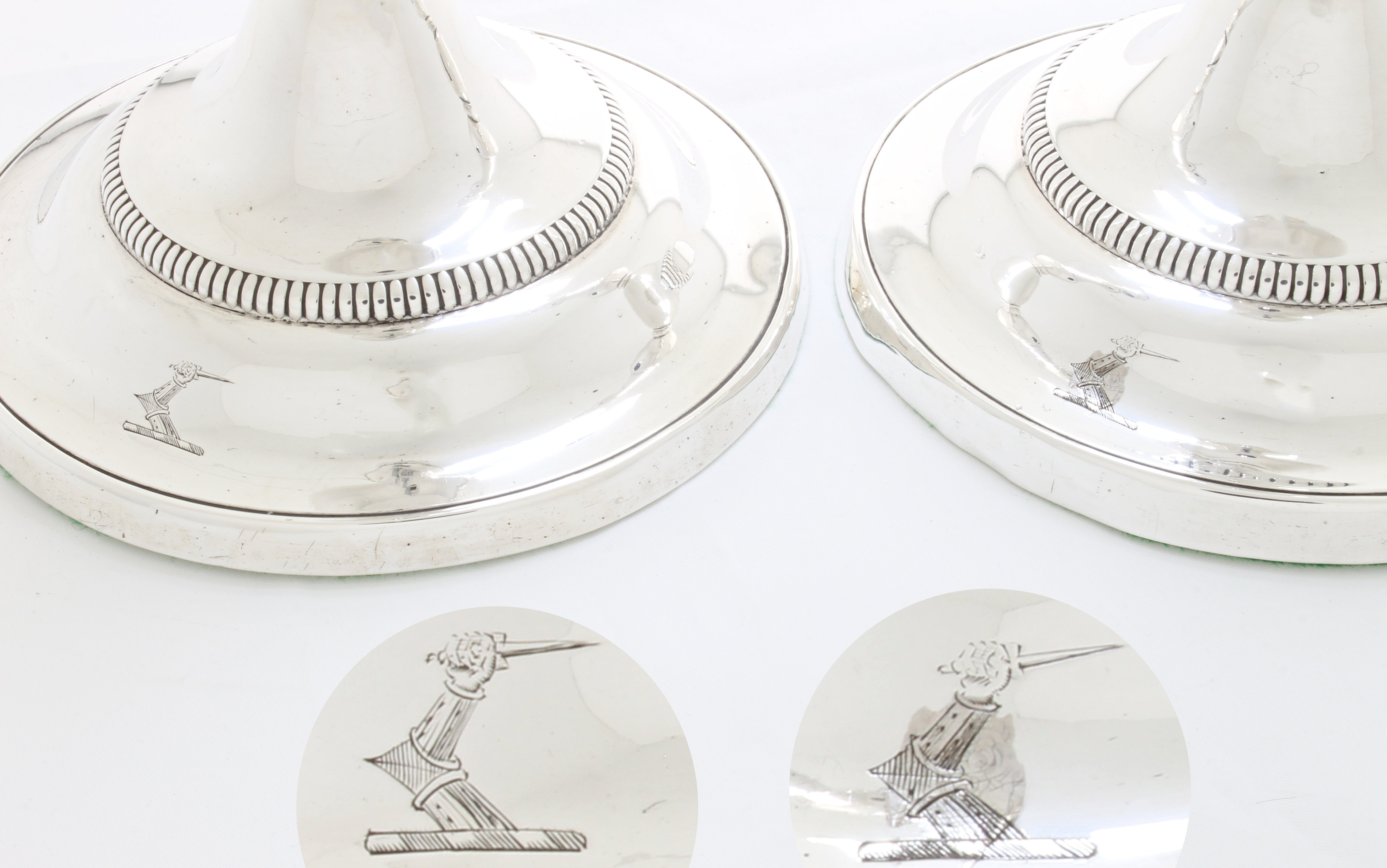 Staat: Goede staat, zeker gezien de leeftijd. De bobeches vertonen enkele gebruikssporen en de bovenzijde van één kandelaar onder de bobeche vertoot gebruikssporen. De voet van één exemplaar vertoont enkele indeukingen en kleine deukjes.