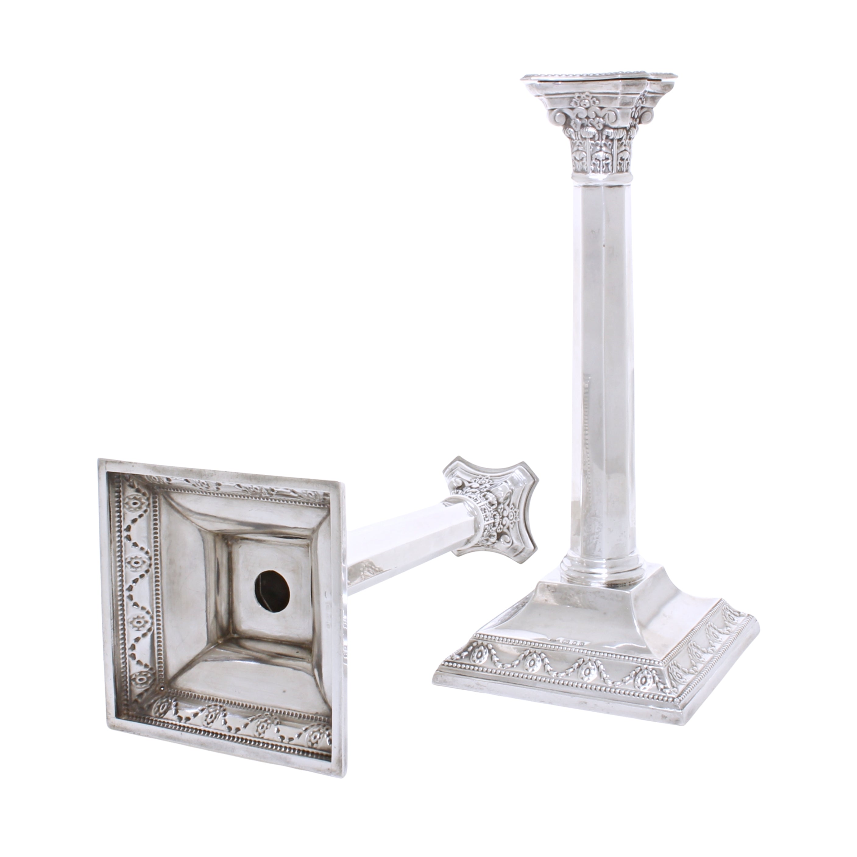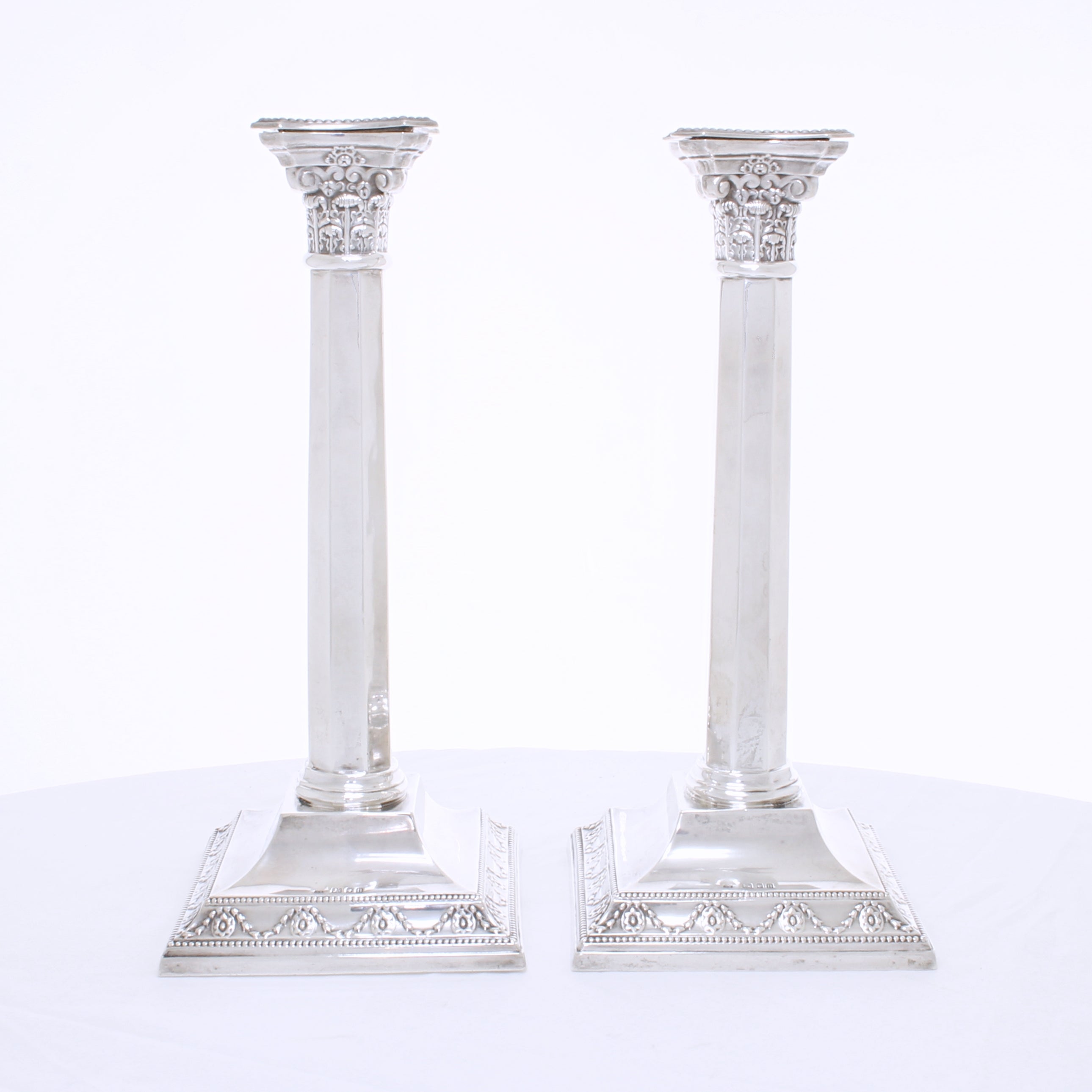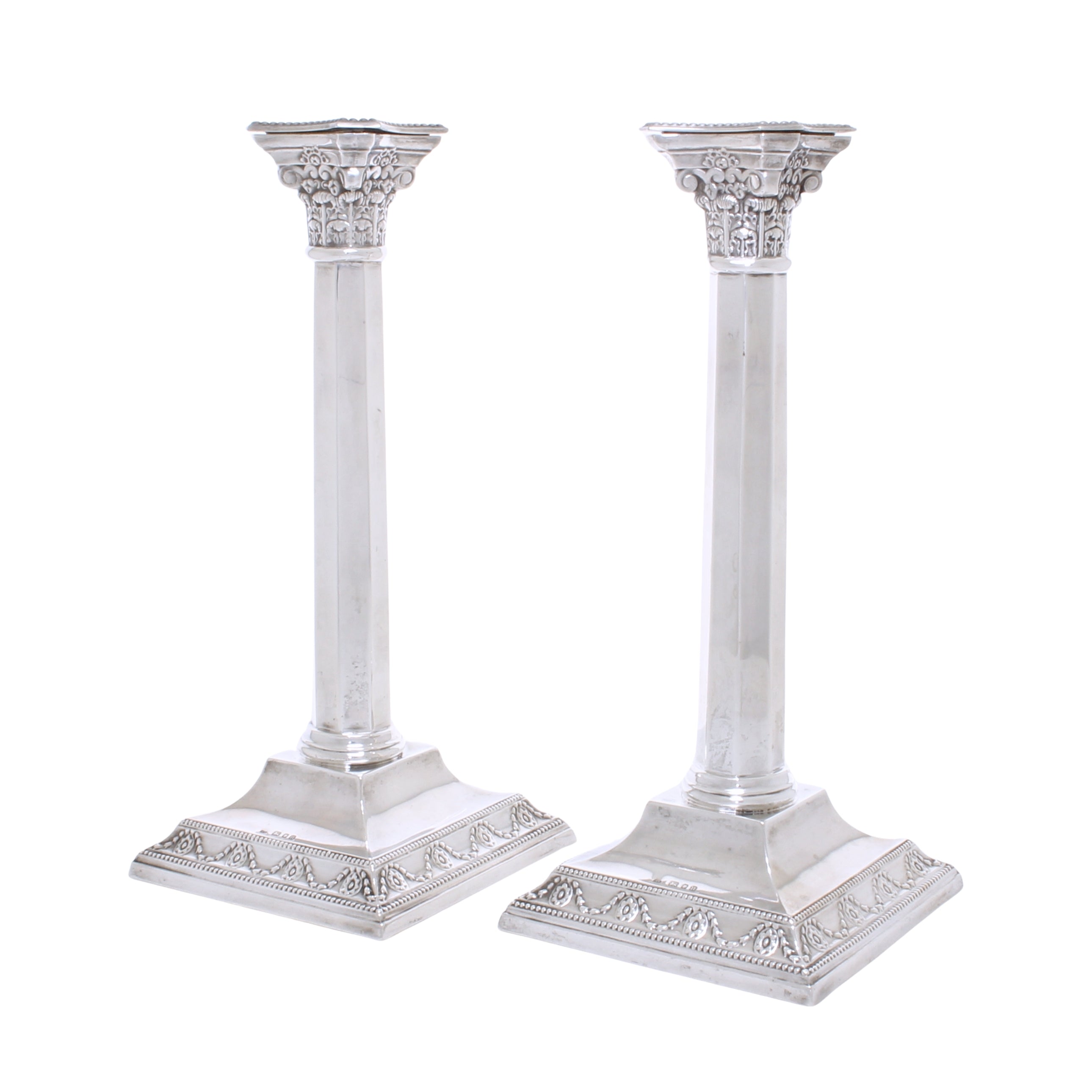 Een elegant paar tafelkandelaars van sterling zilver, uitgevoerd in neoklassieke Korinthische stijl. Een investering in massief sterling zilver?
